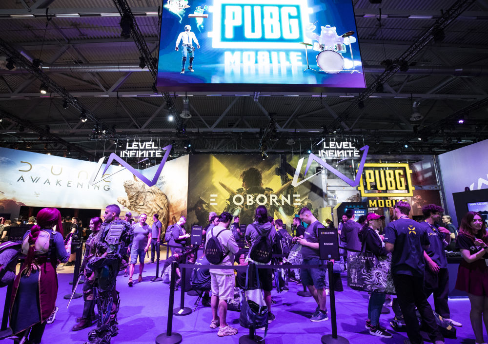 8月21日,在德國科隆,觀賞者在科隆游戲展騰訊展啟動儀式臺依序排列隊伍試玩游戲。新華社記者張帆攝